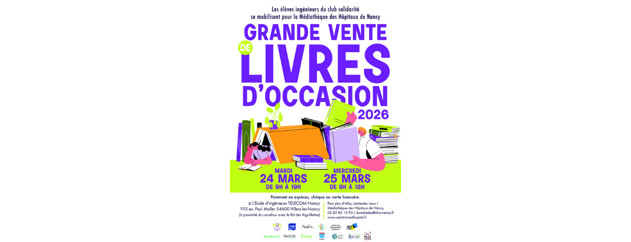 Organisée par la Médiathèque des Hôpitaux de Nancy avec l’aide des élèves ingénieurs de l’école, une vente de livres d’occasion aura lieu à TELECOM Nancy les 24 et 25 mars.